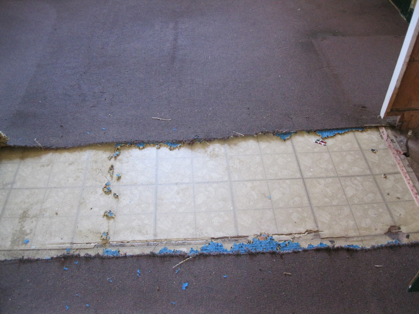 After removing a strip of carpet we find the first of what will become many layers of linoleum.