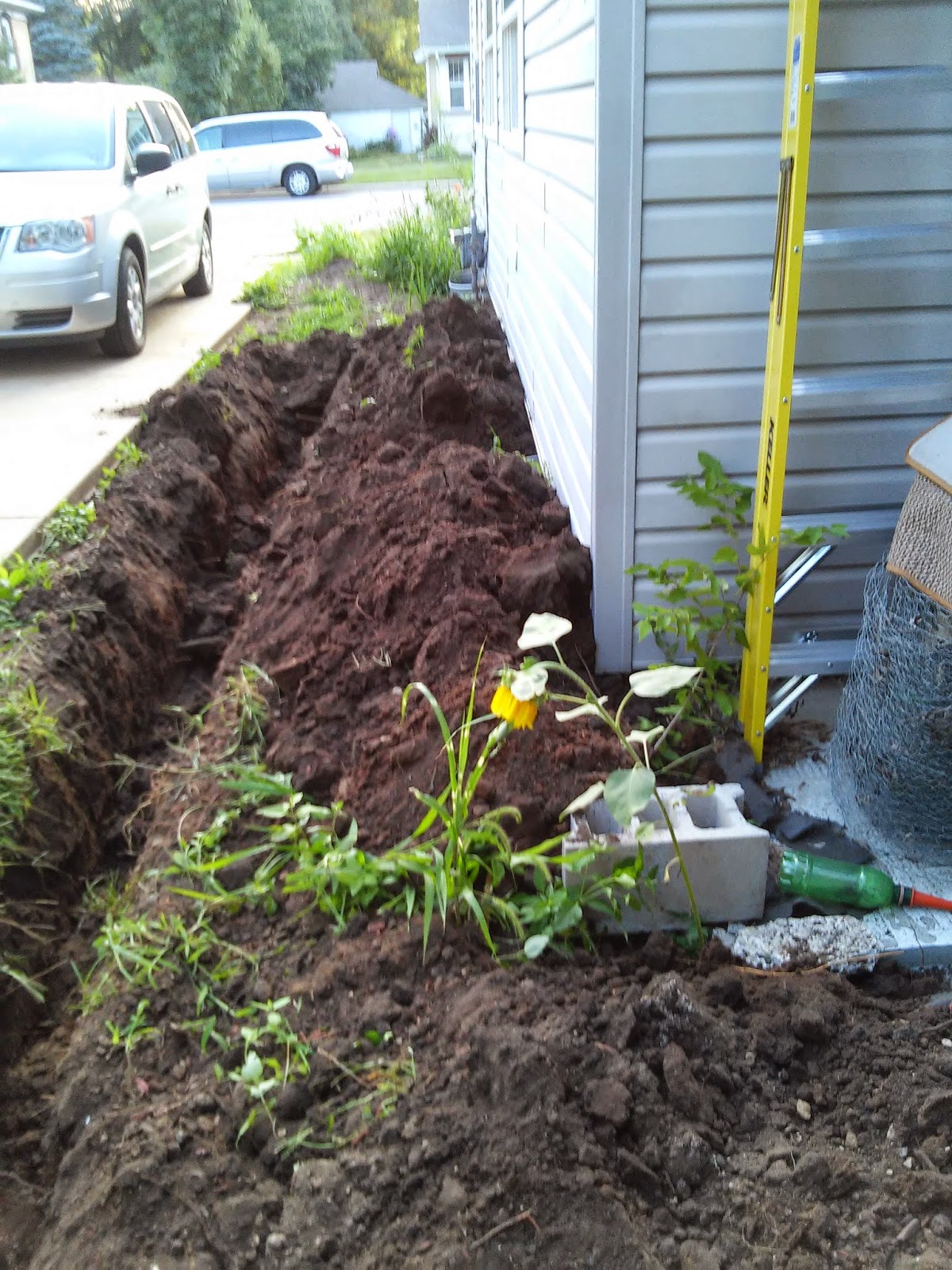 We tore up the yard. Like most of our projects, it didn't go smoothly. The fence that we thought would take 20 minutes to tear out took closer to 2 hours due to the fact it was industrial tornado proof installed. The thing was 3 feet above ground but five feet under, complete with interior and exterior cement and a nice line of rebar through it. If they would've put half the effort into the house that they did into the vinyl fence, we wouldn't be doing all this remodeling!